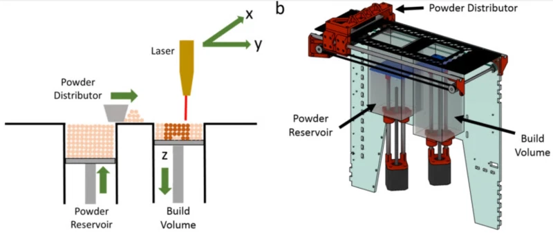 نوع دیگر فناوری های پرینت سه بعدی SLS و DMLS هستند که از فرآیندی به نام زینترینگ استفاده می کنند. در اصل ، هر بار که یک لایه جدید چاپ می شود ، یک استوانه یک لایه نازک از پودر ریز را روی سطح پلتفرم پخش می کند. بعد از اتمام فرآیند پرینت، شی بطور کلی با پودر پوشانده میشود. با توجه به نحوه عملکرد این روش ، اشیاء پرینت شده باید دارای سوراخ هایی باشد که از طریق آنها پودر اضافی ریخته می شود. مواد زینتر نشده میتوانند در سری های بعدی پرینت مورد استفاده قرار بگیرند، که به معنی این است که میزان هدر رفت ماده در این روش حداقل میباشد. مزیت دیگر قابل ذکر عدم دیده شدن لایه های پرینت شده است.